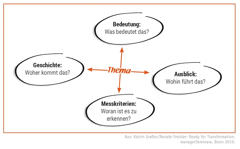 Mit dem „Fragen-Kreuz“ (siehe Download) wird die aktuelle Situation unter die Lupe genommen. - Ein Zielbild wählen und in die Zielvorstellung einsteigen