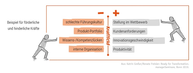 Haben Sie sich bewusst für eine Bearbeitung entschieden? Dann betrachten und klären Sie zunächst den „Veränderungswunsch“ im Detail. Hierzu ist es sinnvoll, sich strukturiert konkreten Vorüberlegungen zu widmen. Dazu nutzen wir eine Kraftfeldanalyse, um konkrete Einflussfaktoren des Anliegens zu identifizieren und zu bewerten. Indem Sie Lösungen in Ihrem Sinn finden und entsprechende Maßnahmen für Ihr Handeln ableiten, werden fördernde Faktoren gestärkt und hemmende Faktoren in Ihrem Umfeld geschwächt.